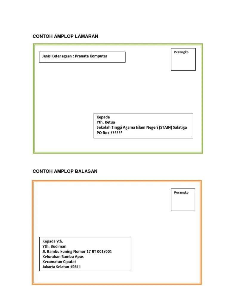 Terkadang bingung bagaimana cara memposisikan alamat pada amplop lamaran kerja hal ini biasa terjadi bagi yg belum pernah mengirim surat . Namun melihat contoh penulisan amplop lamaran kerja mungkin bisa . Bagaimana format penulisan alamat pada amplop surat lamaran dan sebagainya harus dipahami. Tujuannya agar langsung terbaca siapa pengirim dan pemilik dari berkas . Sebenarnya tak ada aturan baku terkait cara menulis nama dan alamat di map. Cara menulis alamat di amplop yang benar untuk mengirim lamaran pekerjaan adalah dengan mencantumkan alamat tujuan dan pengirim pada bagian depan amplop. Cara untuk menulis amplop lamaran kerja. Penulisan alamat di amplop lamaran kerja,ini adalah contoh ,mohon maaf bila ada salah perkataan dan tulisan inti.nya cek lagi sebelum mengirim pt. Identitas di sini meliputi dari nama lengkap (sertakan gelar apabila punya), alamat lengkap mulai dari rt, desa, kecamatan, dan kota hingga kode pos. Cara menulis surat lamaran kerja di amplop surat coklat, menulis alamat ada cara tersendiri atau bentuknya hingga sopan/ sesuai prosedur. Kamu juga bisa menuliskan alamat serta nomor telepon yang bisa dihubungi. Cara menulis alamat di amplop yang benar untuk mengirim lamaran pekerjaan adalah dengan mencantumkan alamat tujuan dan pengirim pada bagian . Alamat kemudian di print di kertas putih, kemudian potong dengan rapi dan tempel di sisi depan amplop.