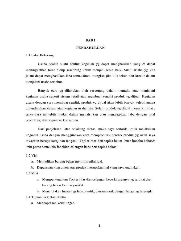 Cara membuat proposal usaha makanan · nama perusahaan · tujuan perusahaan · latar belakang usaha · survey terhadap pasar · peluang bisnis. Bab i pendahuluan 1.1 latar belakang perkembangan fashion dibidang aksesoris. Saya juga membuat kerajinan aksesoris seperti : Laporan kerajinan tangan dari bahan limbah "tempat wadah tisu dari koran. Terutama dalam pembuatan souvenir dari kain flanel.